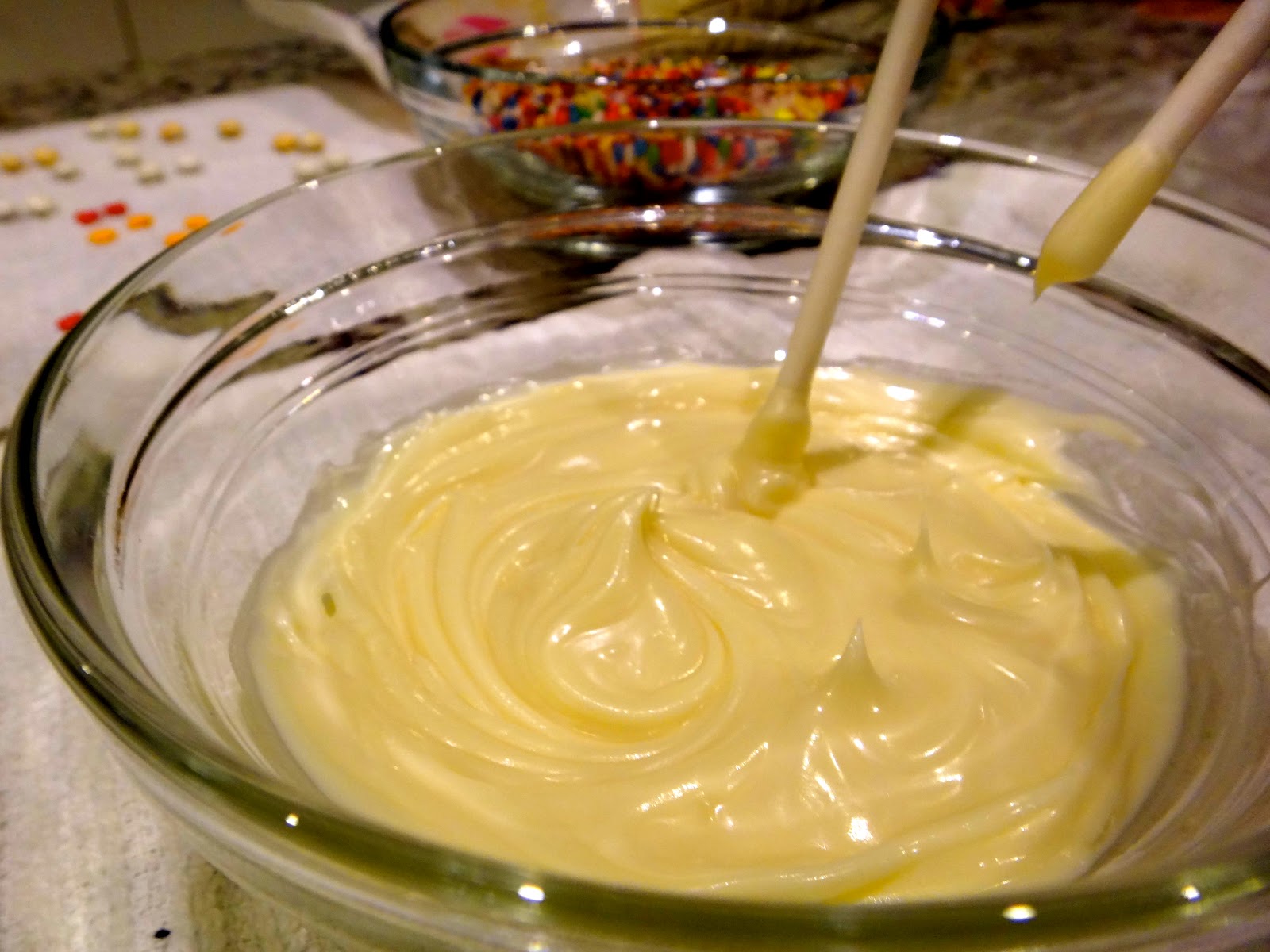 Derrite la cobertura de chocolate. Puede ser de cualquier color y las venden en tiendas de repostería. También puedes usar chocolate, sólo asegúrate de agregar algunas gotas de aceite vegetal ya que esté derretido. Derrite en el microondas (esta vez está bien), con intervalos de 15 o 20 segundos y justo cuando las chispas se siguen viendo pero ya esta suave, revuelve y lo más probable es que esté en su punto.