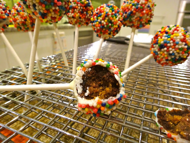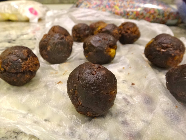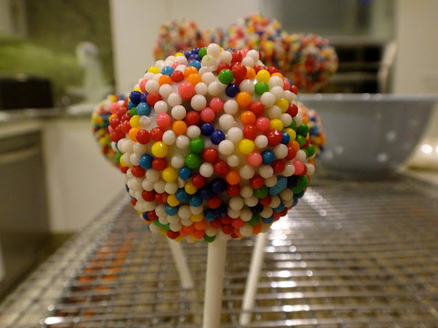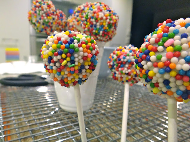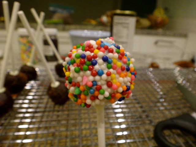 Y sumerge en la cobertura, quitando el exceso con un palillo. inmediatamente espolvorea los chochitos. Me doy cuenta que de ese paso no tengo foto, quizá porque necesité trabajar rápido y con las dos manos. Pero no tiene mayor ciencia, sólo asegúrate que toda la bolita esté cubierta y quita los excesos.