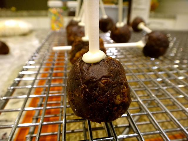 Mete la punta del palito de paleta en la cobertura, inserta en la bolita de brownie.