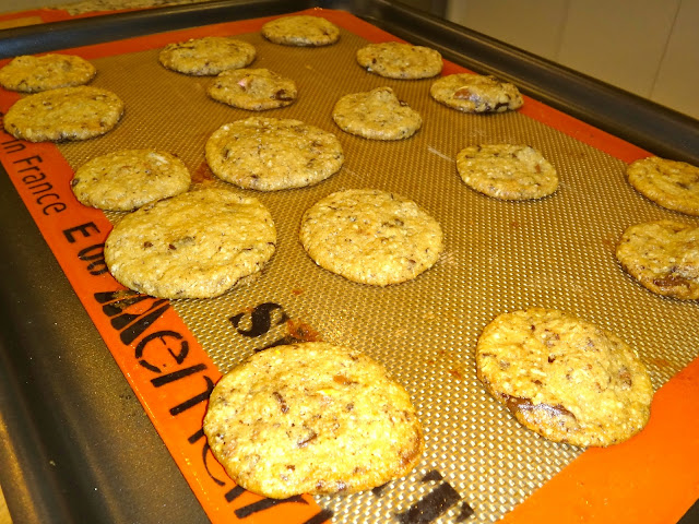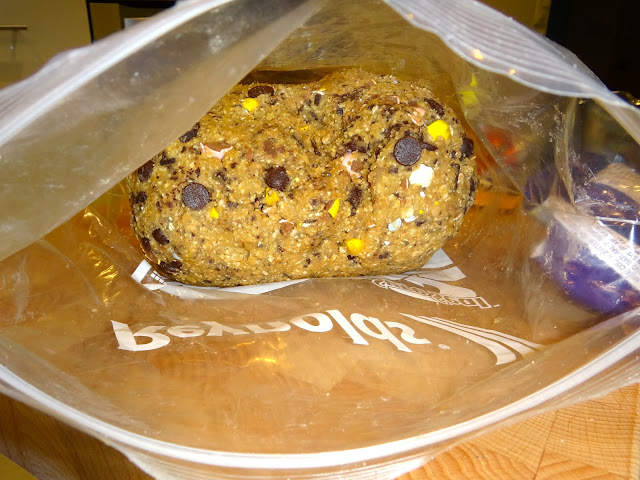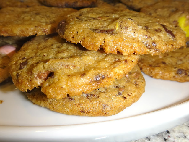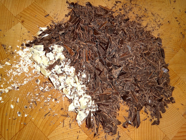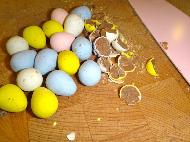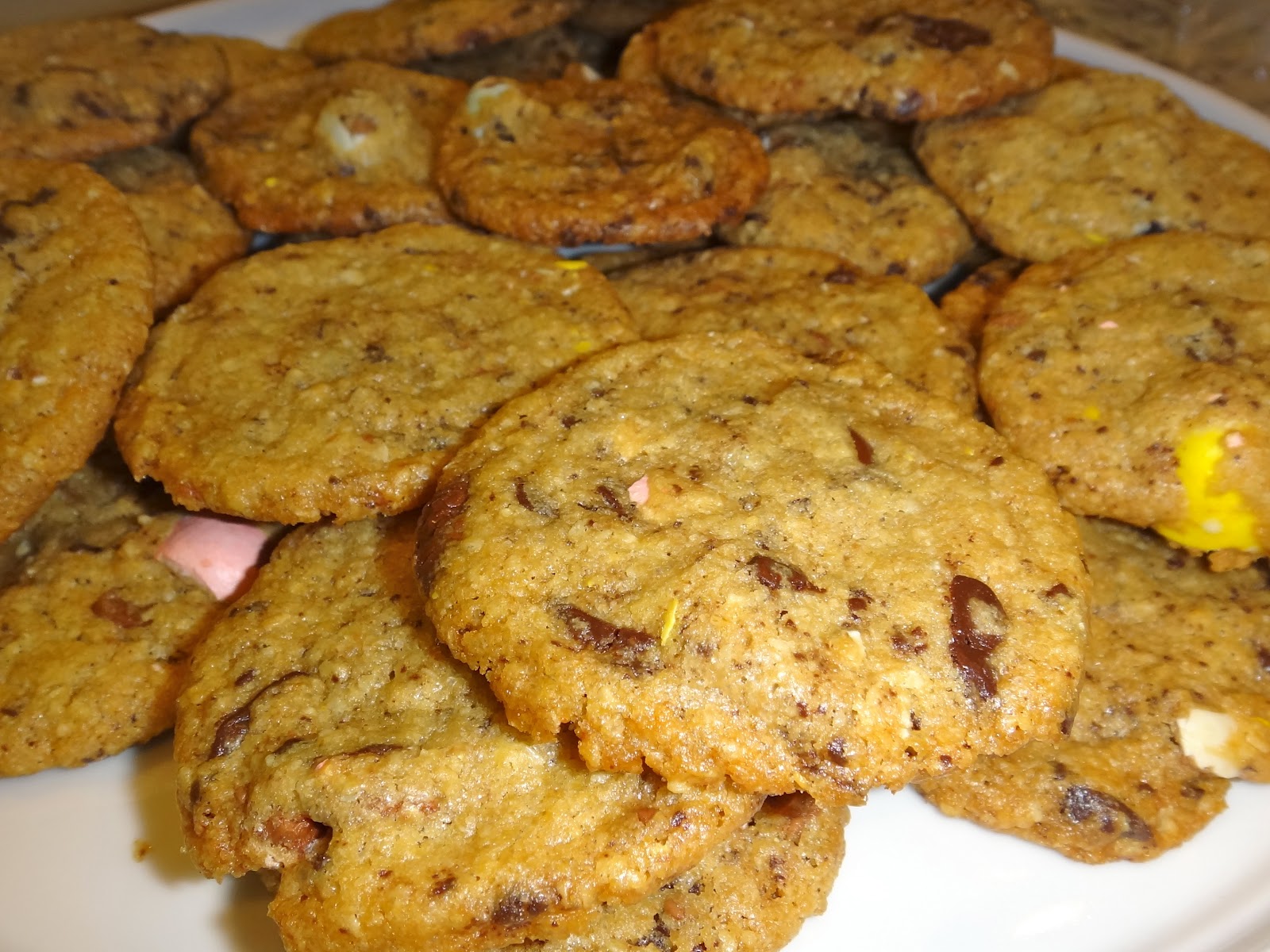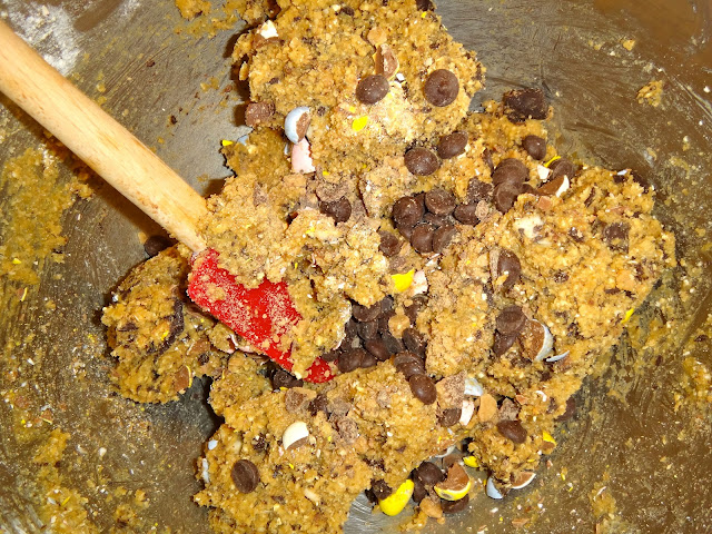 Y las chispas. Además de chispas de chocolate semi amargo, me gusta picar chocolates que tenga en la despensa, está vez fueron huevitos Cadbury de Pascua. Una parte picada finamente. (En el horno eso se derrite en la masa.. yum.