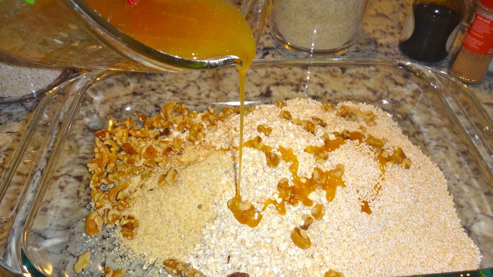 - En un molde para hornear, mezcla los ingredientes secos y agrega poco a poco la miel.