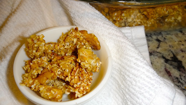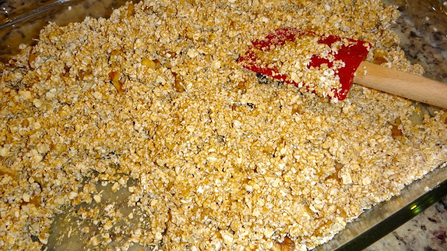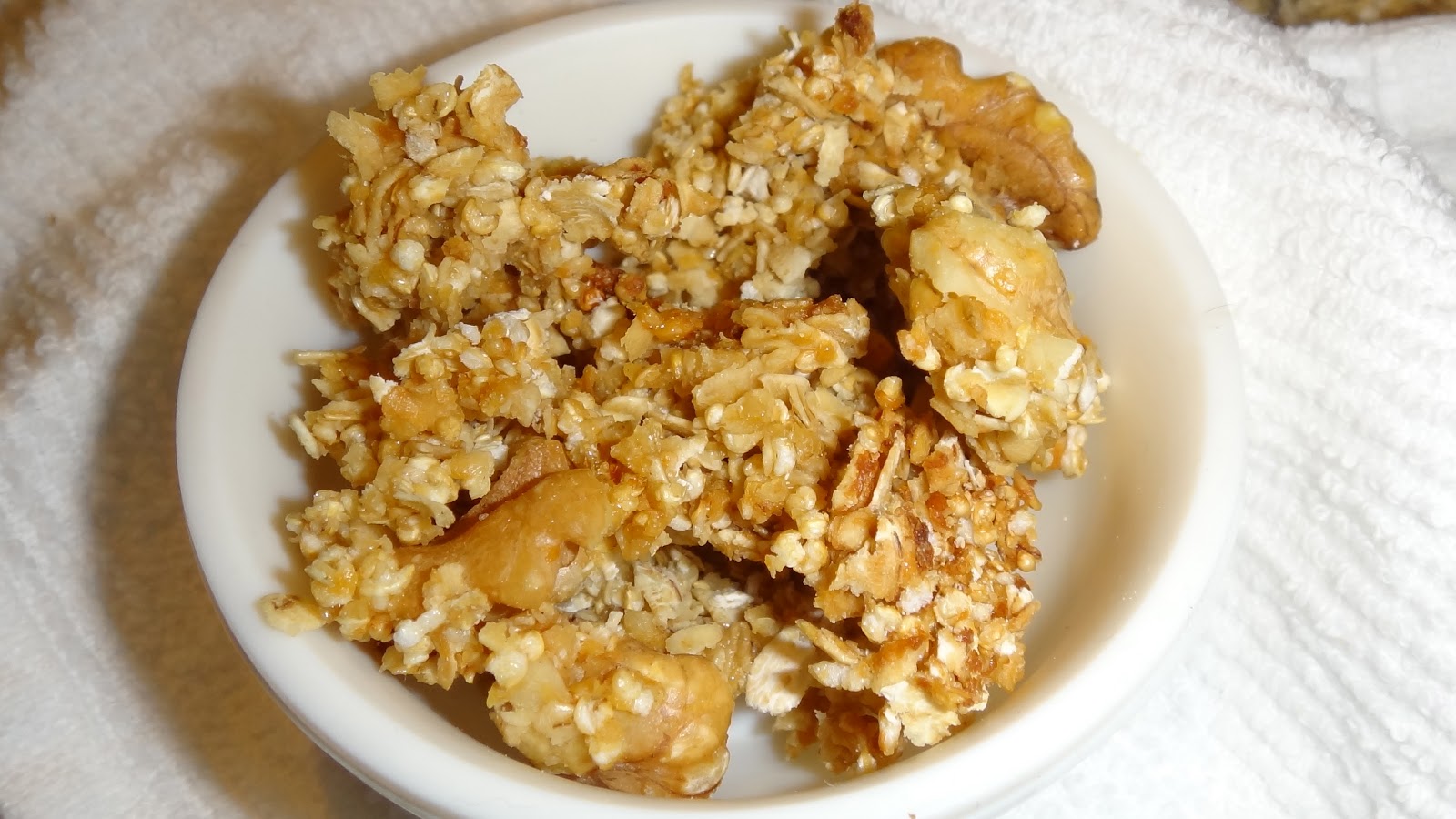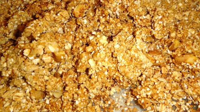 Esta vez, sólo voy a hacer una granola base, con miel, salvado, avena y amaranto. Nuez también. Así se puede convertir en el sabor que queramos a la mera hora. O ser delicioso por si mismo.