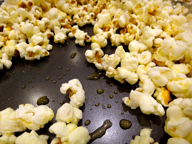 Las 4-5 tazas palomitas, ya sean de microondas o cacerola, reciben el baño de las mieles, un poco de canela y pizca de sal.