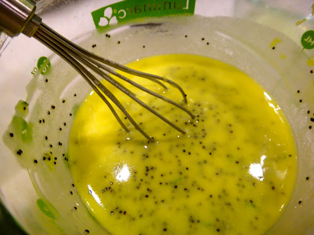 Aparte, revuelve la crema, jugo de limón (yo usé limón amarillo) y ralladura. Agrega las semillas de amapola y revuelve. Al último, agrega mantequilla derretida y bate bien.