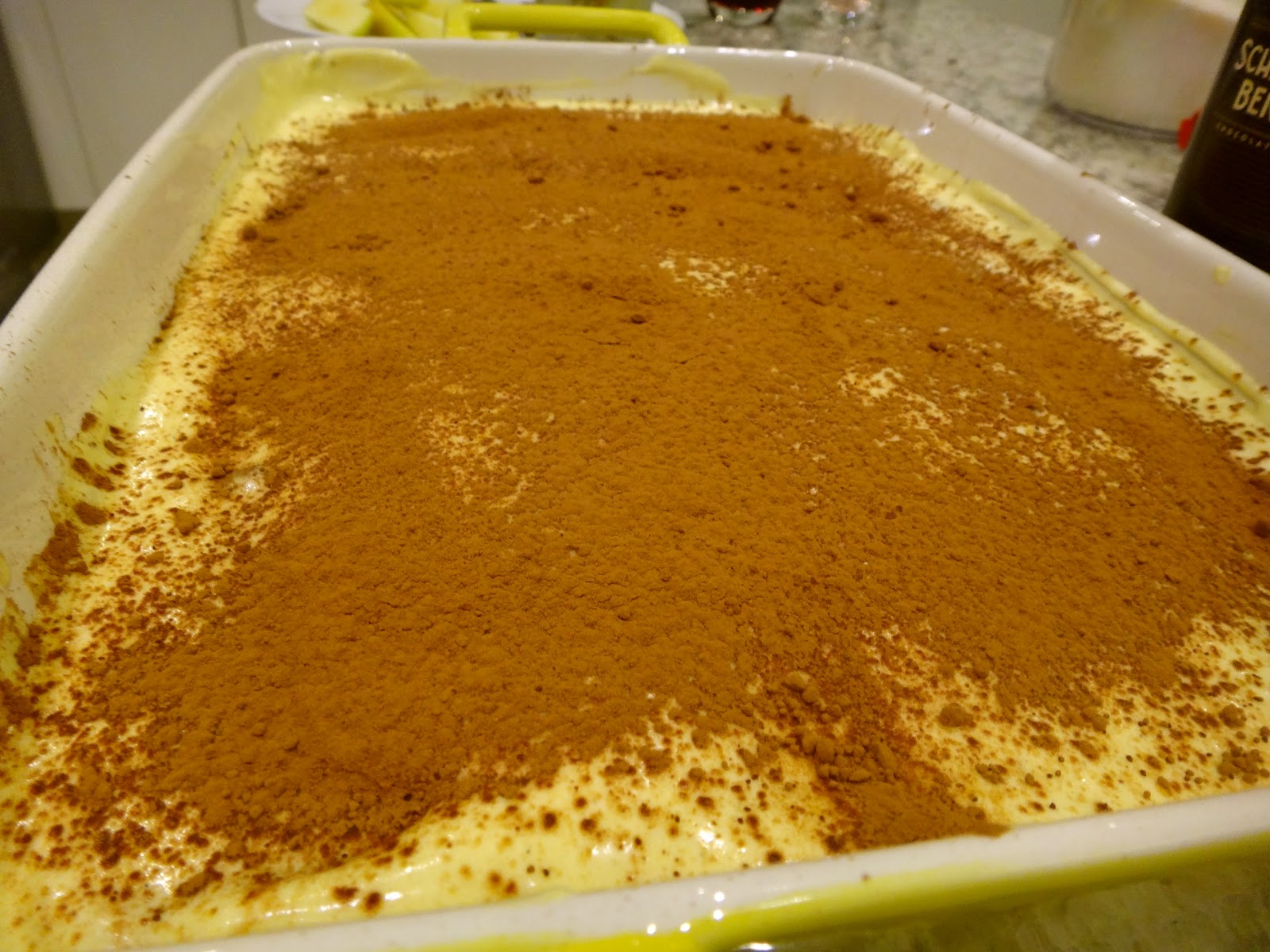 Y termina con una buena espolvoreada de cocoa al final. Este es uno de esos postres que mejoran con el tiempo, así que refrigera por una noche. (o mínimo unas horas)
