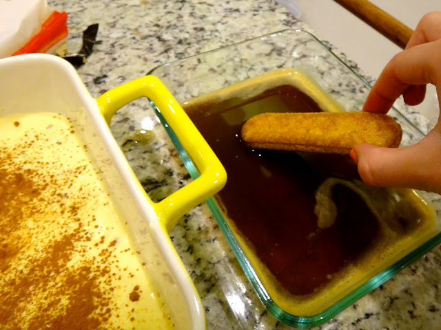 Y ahora, a armar el Tiramisu. Remoja cada soleta en la preparación de café y acomoda en el molde.