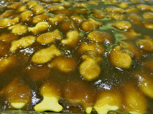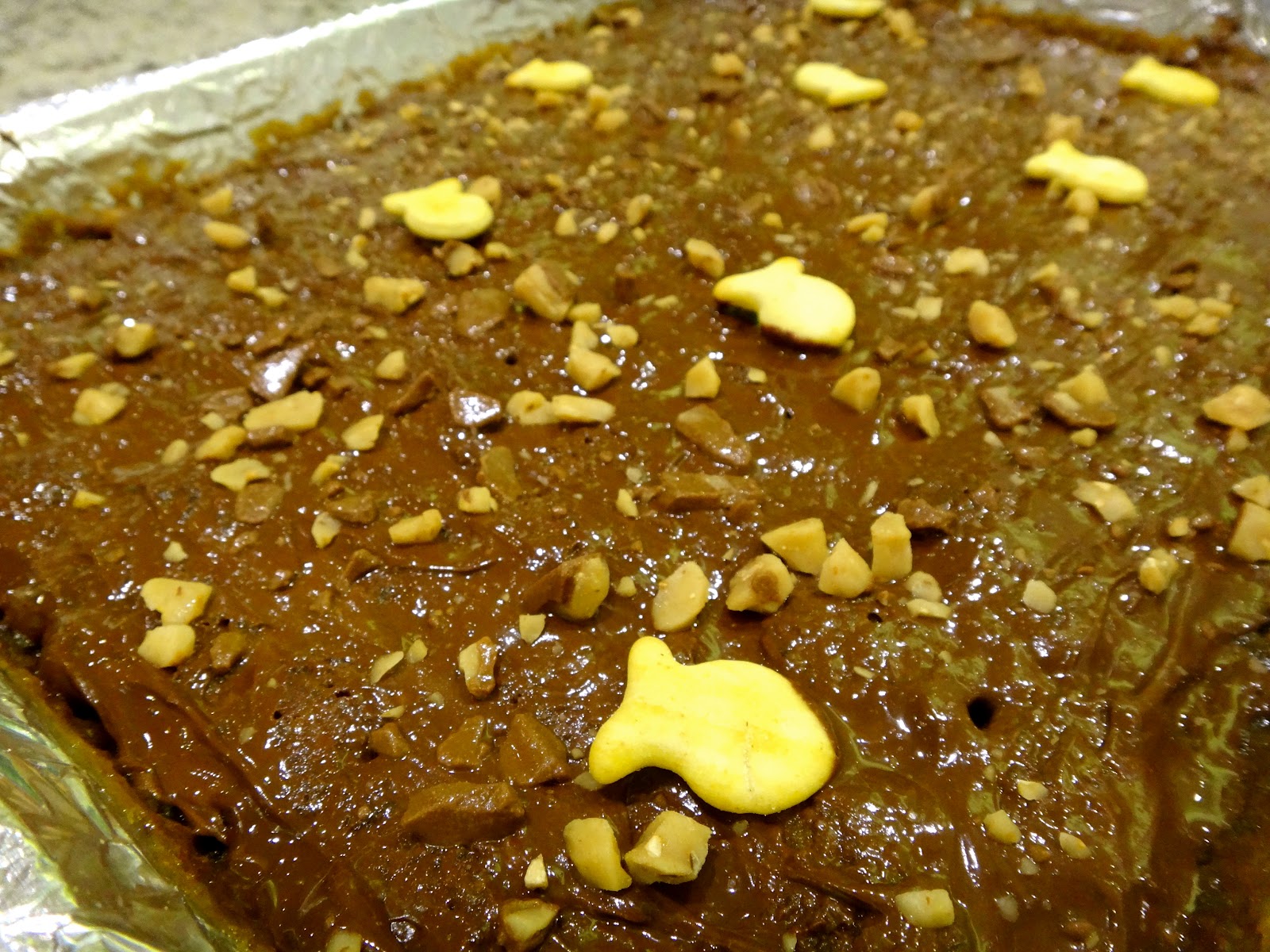 Luego espolvorea nueces o tu chocolate favorito en pedazos y algunos pescaditos, para que sepan de qué está hecha la confección.