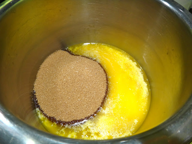 Luego derrite una taza de mantequilla y agrega una taza de azúcar moscabado.