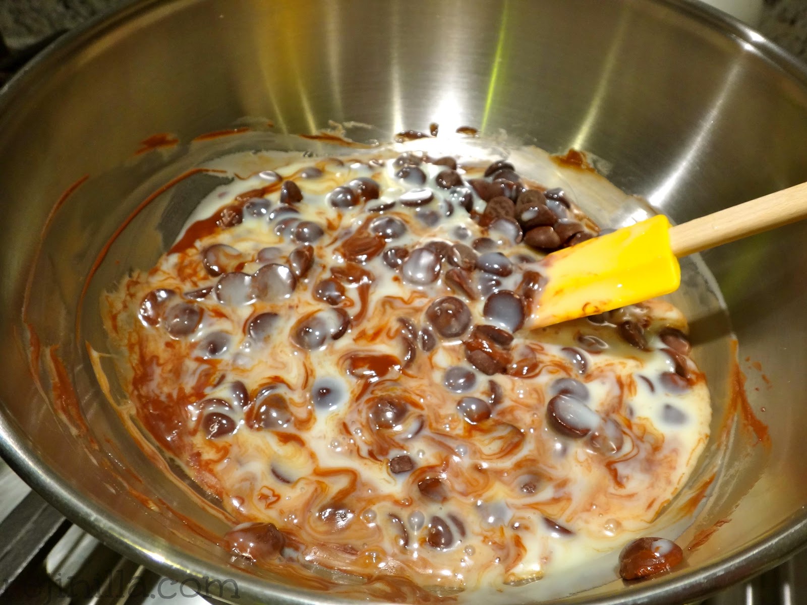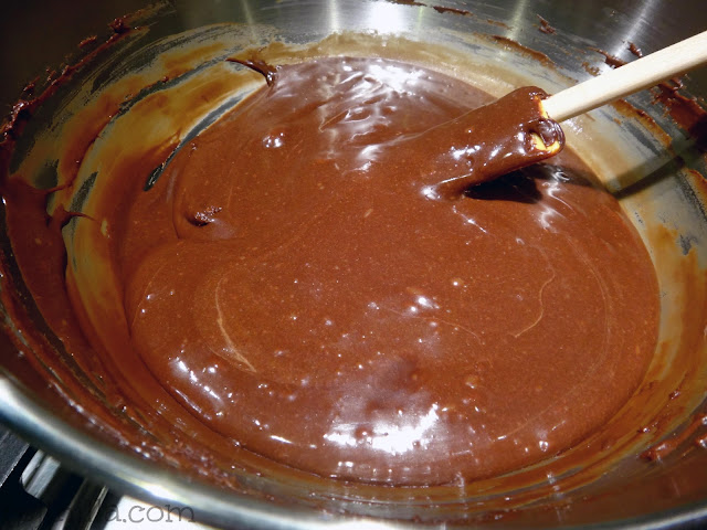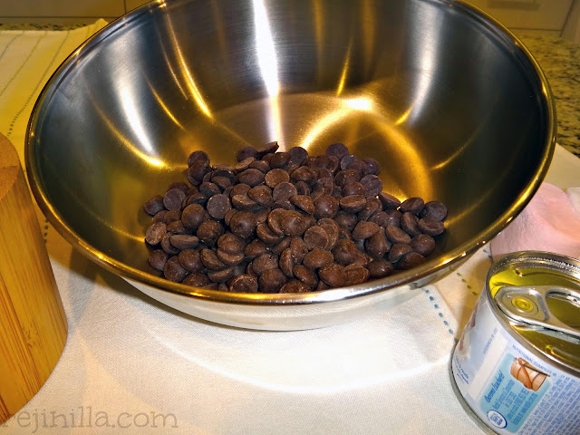 **Derrite a Baño María cantidades iguales (en gramos y ml) de leche condensada y chocolate, por cada 100g de chocolate agrega 3 bombones grandes, y una cucharadita de mantequilla. Termina con una pizca de sal y cucharadita de vainilla.