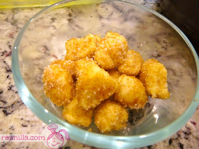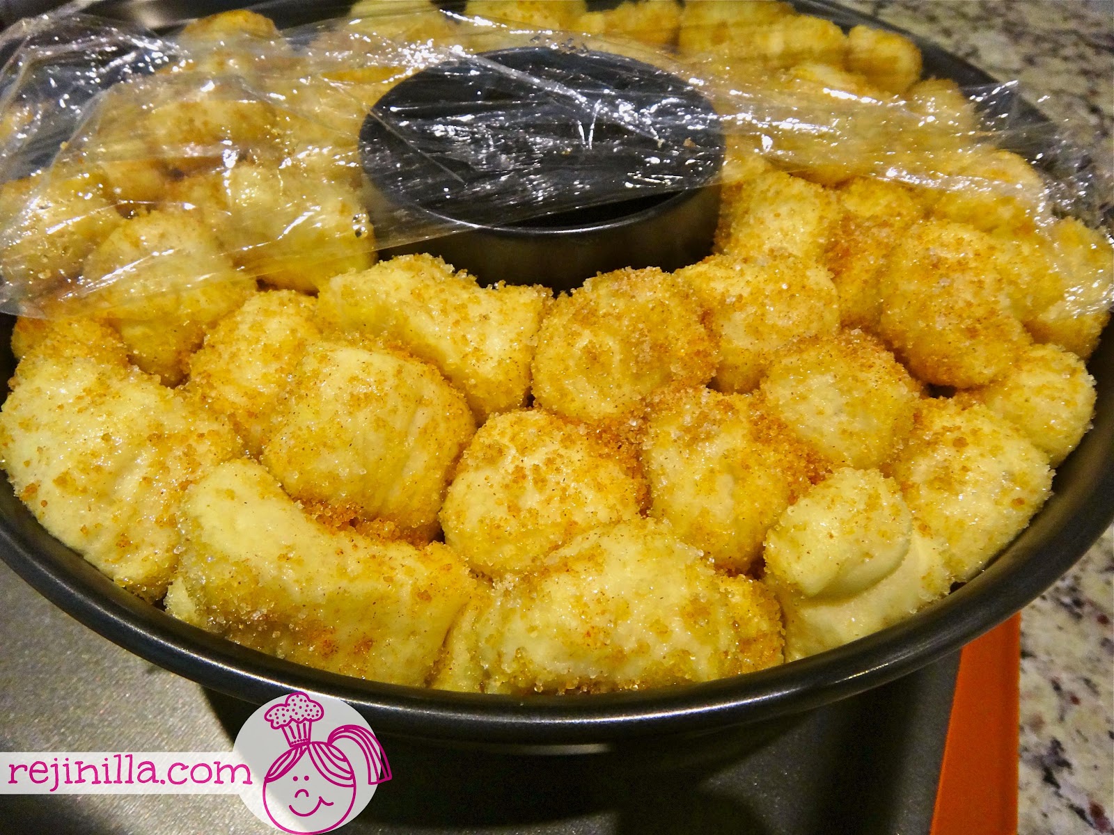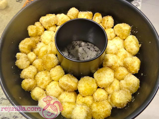 - Pasa cada bolita por la mantequilla derretida, quitando el exceso y por una mezcla de azúcar y canela. Acomoda en un molde previamente engrasado. Continúa con todas las bolitas.