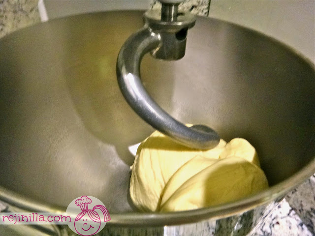 - Cambia al gancho de la batidora y continúa mezclando por 8 minutos o hasta que la masa deja de ser pegajosa.
