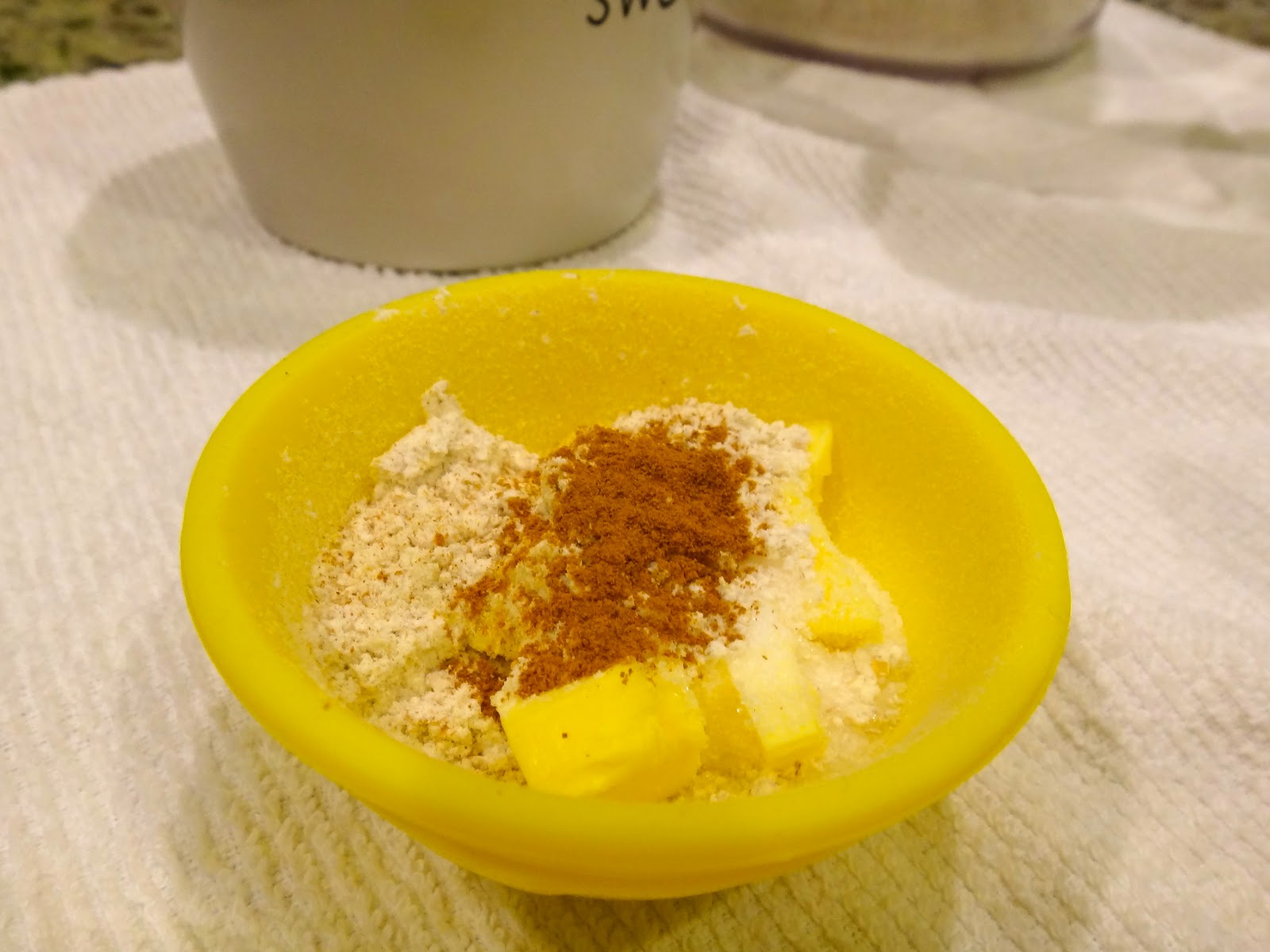 Aparte mezcla con los dedos una cucharada de mantequilla, dos de harina, una de azúcar y un poco de canela.