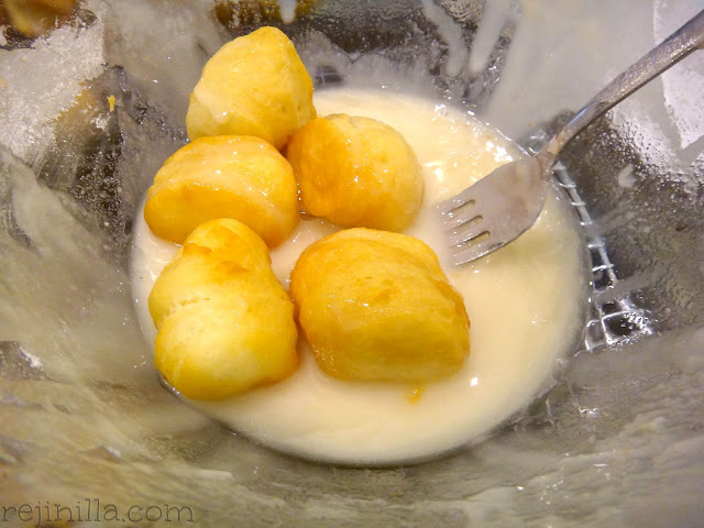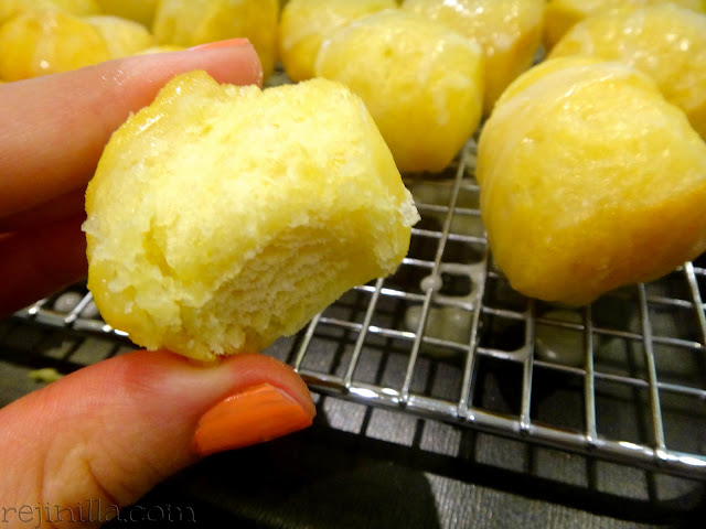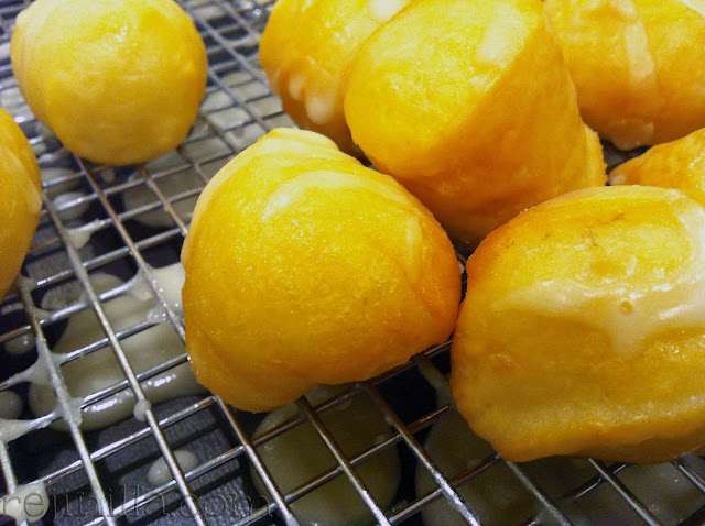 Escurre el exceso de aceite y acomoda en servilletas de papel. Luego pasa a un bowl lleno de glaseado (hecho con azúcar glass, vainilla y agua). Cubre completamente y sacude el exceso con un tenedor.