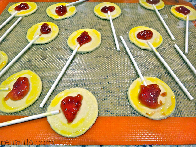 Coloca el relleno (yo usé mermelada de fresa, pero puede ser cualquier cosa en el mundo- casi- por ejemplo jamón y queso, chilorio, manzana, nueces y dulce de leche…etc). Barniza alrededor con un huevo batido.