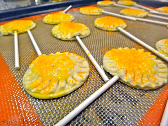 Coloca los círculos encima y presiona con un tenedor las orillas. De esto al parecer no tomé foto, pero igual se lo imaginan. Barniza las partes de encima con el huevo, espolvorea un poco de azúcar encima- yo usé azúcar de color naranja.