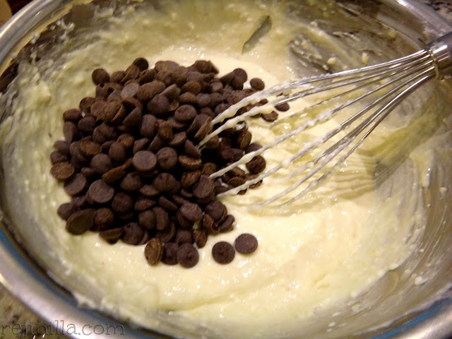 Acrema el queso con el azúcar, agrega el plátano, huevo, vainilla y al último las chispas de chocolate.