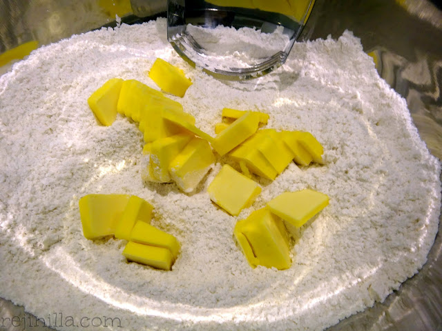 Mezcla la mantequilla en trozos con los ingredientes secos. Usa un tenedor, dos cuchillos o el aparato cortador de masa (no me sé el nombre técnico) que uso yo.