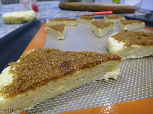 7. Corta en tríangulos (o cualquier figura, es lo de menos) y coloca en charolas para horno, dejando espacio entre cada uno.