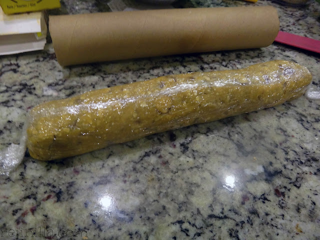 Con la masa lista, puedes hacer un tubo de masa cubriendola con plástico (usé un tubo de cartón de servilletas para guardarlas en el refrigerador y que no perdieran forma, pero no es vital.) Cuando sea hora de hornear, sólo rebana la masa y acomoda en charolas.
