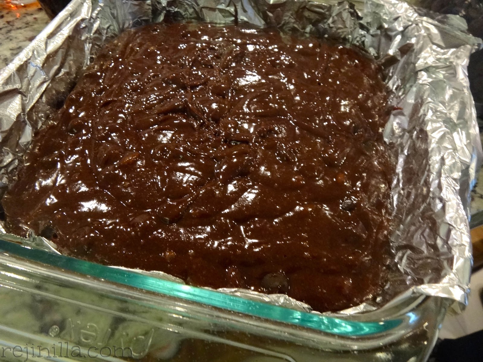 Vierte en un molde con papel aluminio y spray antiadherente. (Tip para ahorrar tiempo: no se pega, es mas fácil cortar en cuadritos, no se ensucia el molde– malo para ambiente =( )