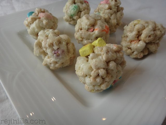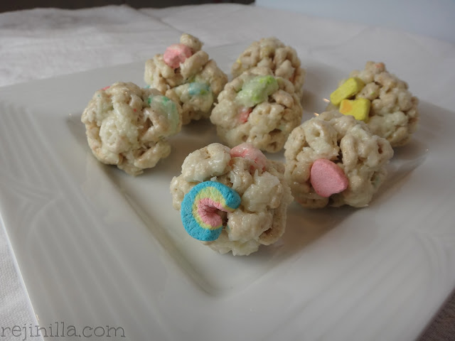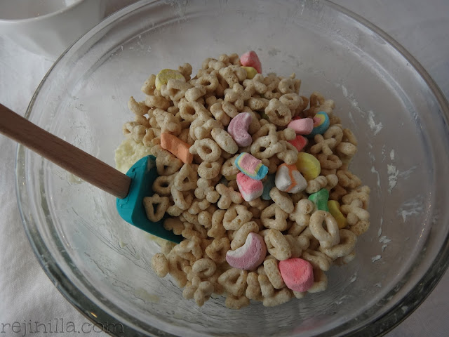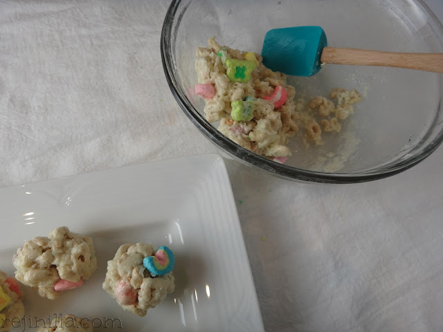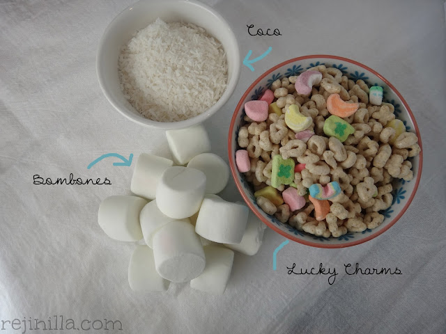 A propósito del Día de San Patricio, usé uno de mis cereales favoritos de toda la vida, Lucky Charms. El sabor no se parece a los clásicos Rice Krispies Treats, pero es igual o más fácil de hacer, está lleno de coco, bomboncitos del cereal y bombón derretido que lo mantiene todo junto.