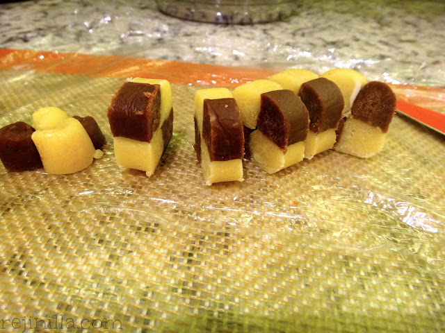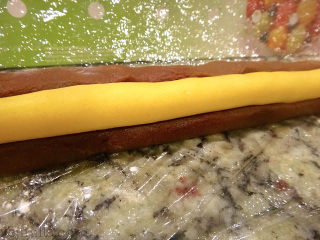 - Haz “tripas” con cada masa y acomoda alternando sobre plástico autoadherente para hacer un cilindro.