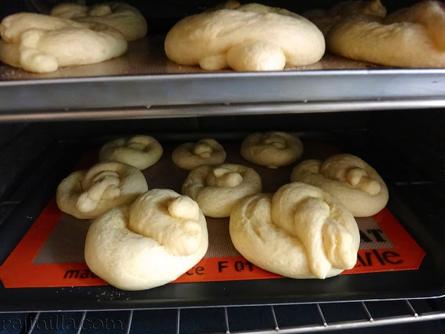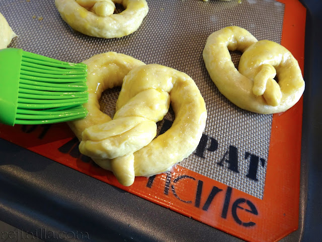 Cubre con una toalla de cocina o con plástico y deja que se esponjen los pretzels (o nudos) otra vez por una hora.