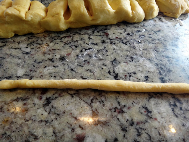 Amasa la masa un poco y corta en 15 pedazos. Haz tripitas (o lombricitas) y dobla para formar un pretzel.