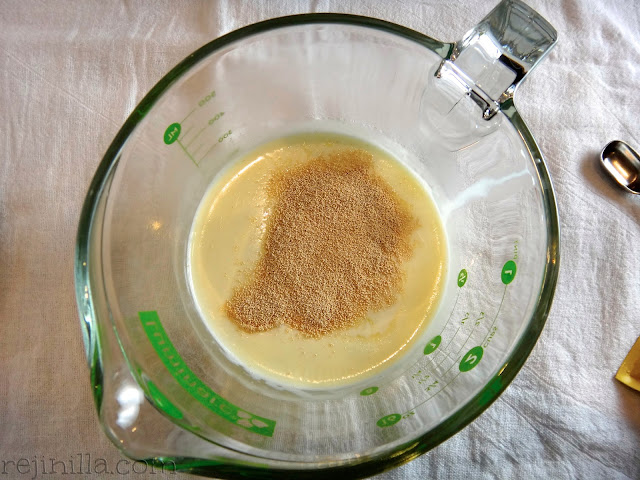 Es un pan de levadura (mi tipo de postre preferido para hacer últimamente…). Así que calienta ligeramente la leche, agrega azúcar y la levadura. Deja reposar por cinco minutos- vas a ver algunas burbujitas, es la levadura haciendo su trabajo.