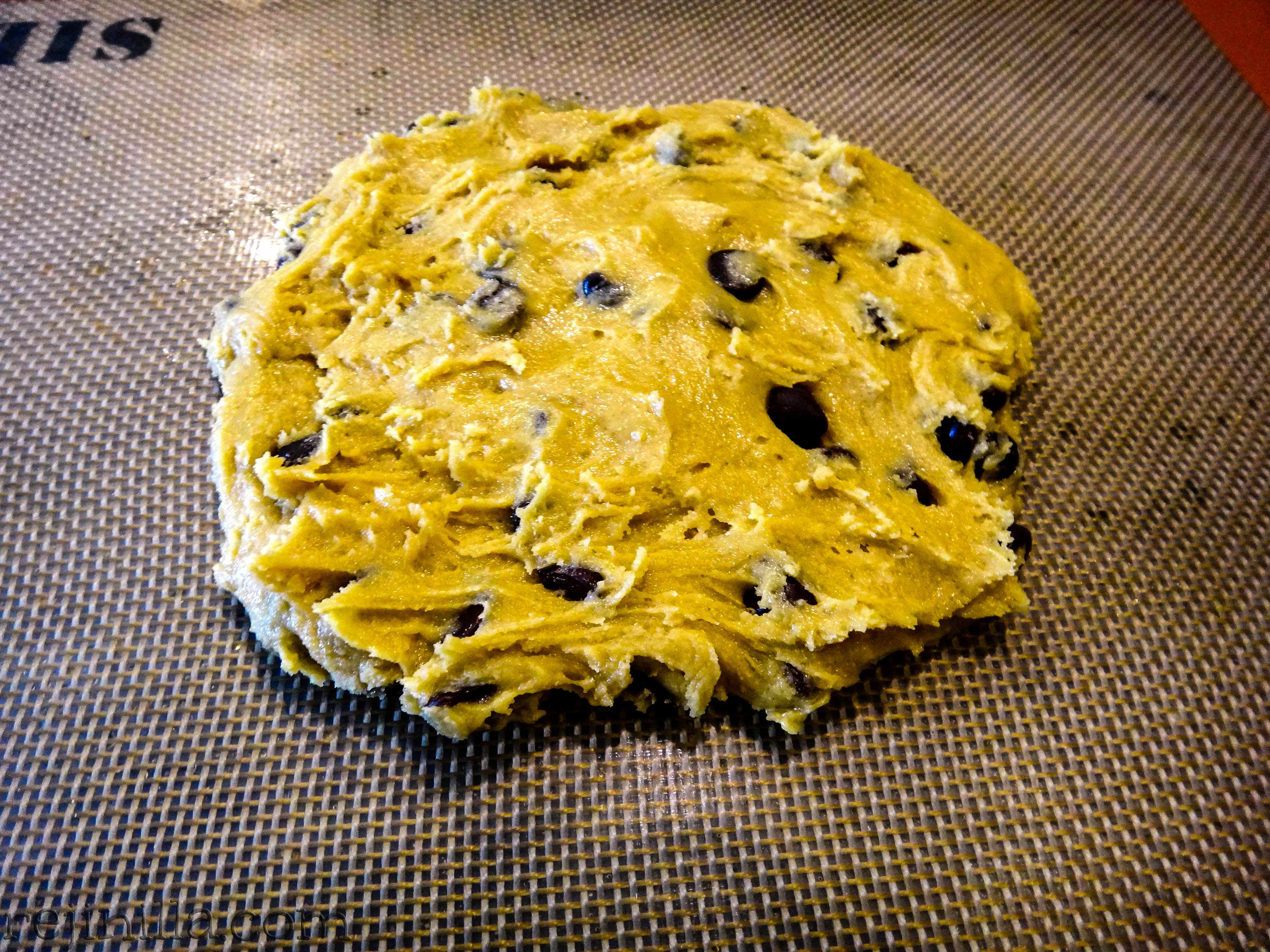 Sólo hay que mezclarlos. galleta para uno-3¿Algún antojo especial? Mételo a la masa. Chocolate picado, dulces, lunetas, chiclosos, avena, etc.galleta para uno-4Aplana en un silpat y hornea hasta que empiece a dorarse…galleta para uno-5Yum!galleta para uno-7 galleta para uno-6