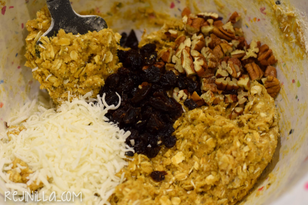 Por último, los ingredientes extras, coco, nueces y pasas picadas. Agrega lo que quieras en este paso, arándanos, almendras, frutos secos o hasta chispas de chocolate.