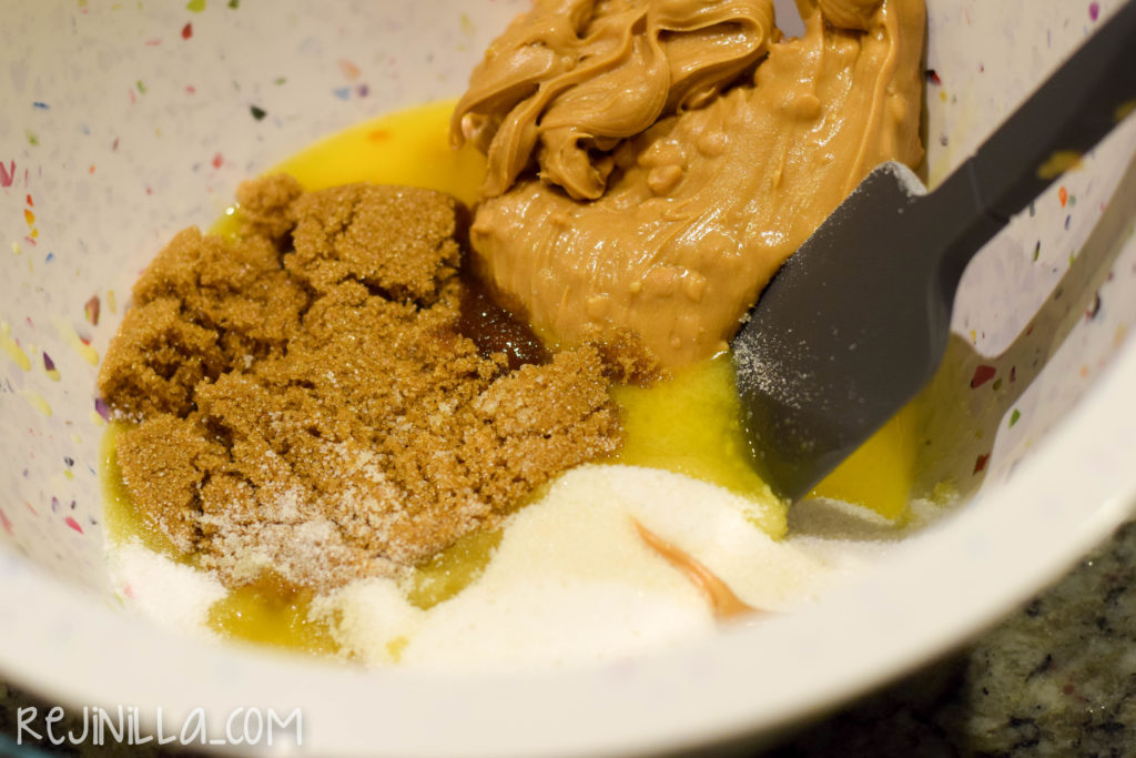 • Mezcla la mantequilla, la crema de cacahuate y azúcar hasta integrar perfectamente. Agrega el huevo y la mantequilla. Bate bien.