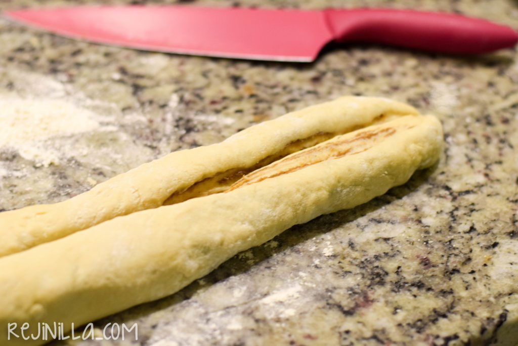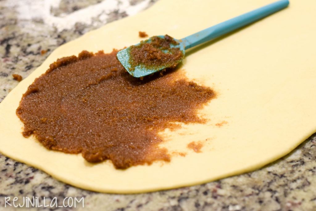6. Para hacer la trenza, estira la masa usando un rodillo, hasta que quede un rectángulo de 5mm de espesor. Esparce el relleno uniformemente, dejando un borde limpio de 1 cm.