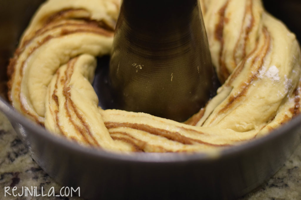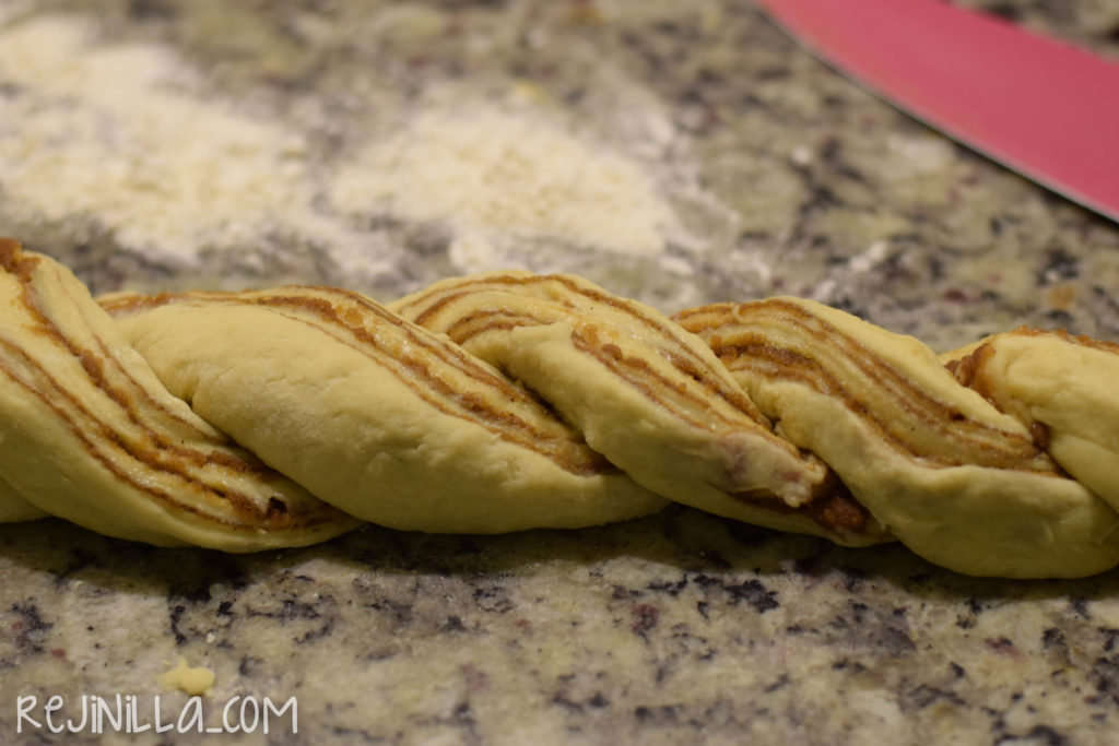 Déjenme explicar qué es un rollo rosca de canela. Es una rollo de canela gigante, hecho rosca. Es muy fácil de transportar, fácil de hacer y sobre todo muy fácil de compartir. Te ahorras el espacio que llevaría hacer los rollos individuales (aunque si eso es lo que quieres, no dejes que yo te detenga, te recomiendo esta receta aquí.) Como todos los panecitos hechos en casa, es mejor comerlo saliendo del horno, sólo o acompañado con un glaseado calientito. Uff!  Prepara el relleno del rEspaEnrolla y corta a lo largo a la mitad, trenza tratando de dejar la parte canelosa expuesta hacia arriba.Acomoda en un molde para rosca engrasado y deja leudar…Después hornea y disfruta!! Se empieza a caramelizar en las orillas… Un baño de glaseado es opcional…