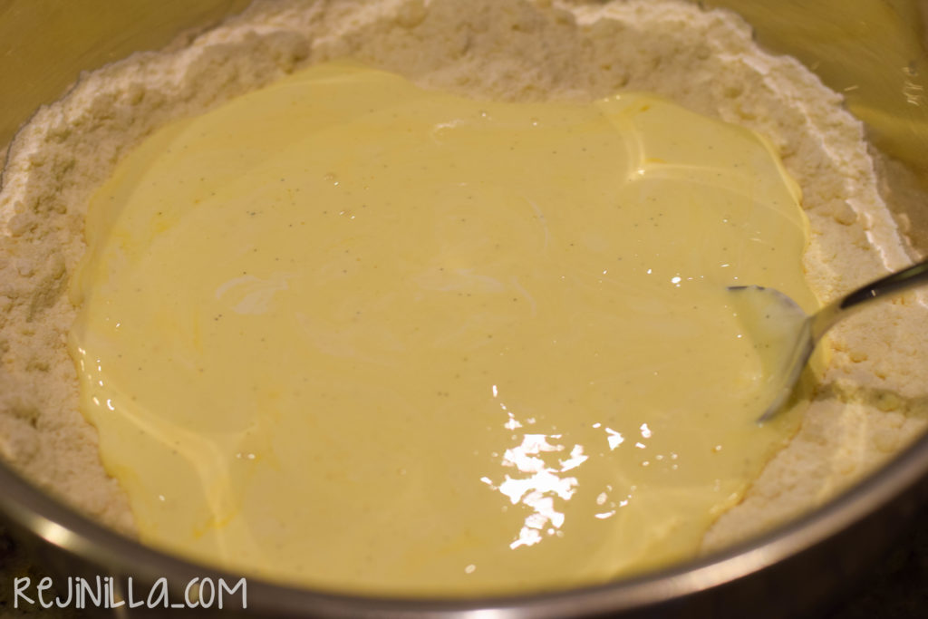 Con mucho cuidado, mezcla lo seco con lo húmedo. De las cosas más importantes que recordar al hacer scones es: NO MEZCLES DE MÁS !! La masa seguirá seca y migajosa (es una palabra de verdad ;))
