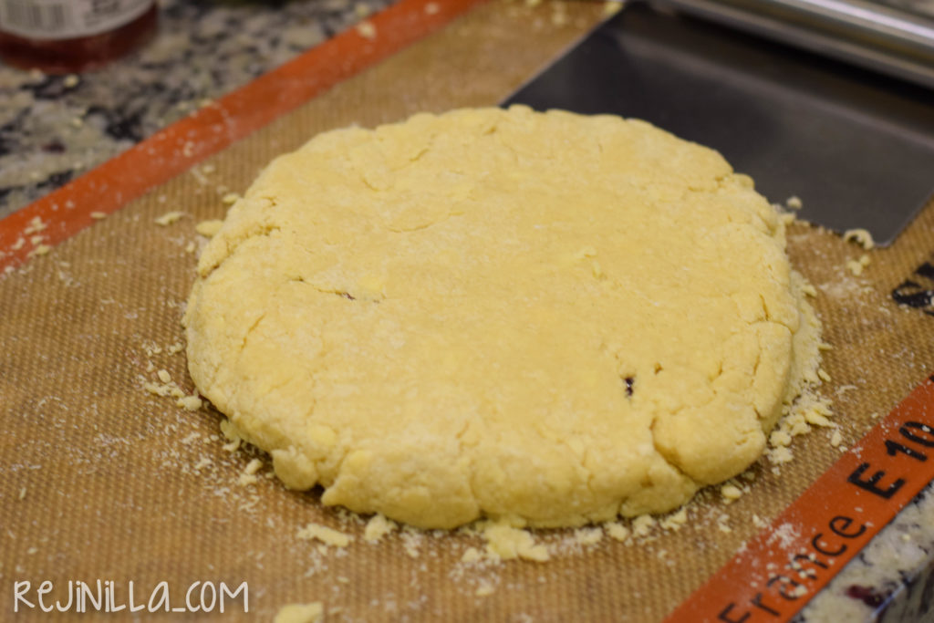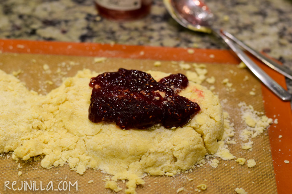 Haz dos discos de masa migajosa y sobre uno de ellos, pon mermelada, tápalo con el otro disco. Yo usé mermelada de frambuesa porque sin duda es mi favorita, pero puedes usar la mermelada que más se te antoje o la que tengas a la mano, chabacano, naranja, fresa, etc.