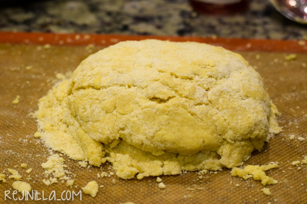 Empieza ” cortando” la masa con la mantequilla, con los dedos, tenedor o con un cortador de masa. Mezcla y corta hasta formar grumitos de mantequilla y harina.
