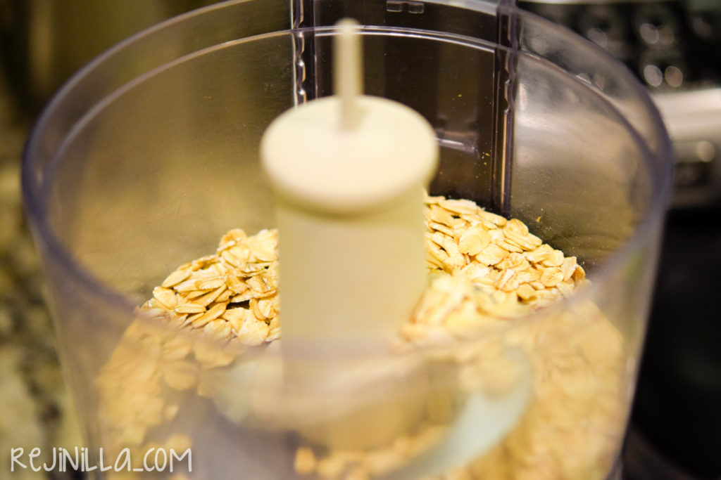 Lo primero que tienes que hacer es moler la avena. Ésta será la harina que usaremos. Si eres Gluten Free, usa avena certificada sin glúten… Procesa hasta tener polvo, un poco de textura está bien.