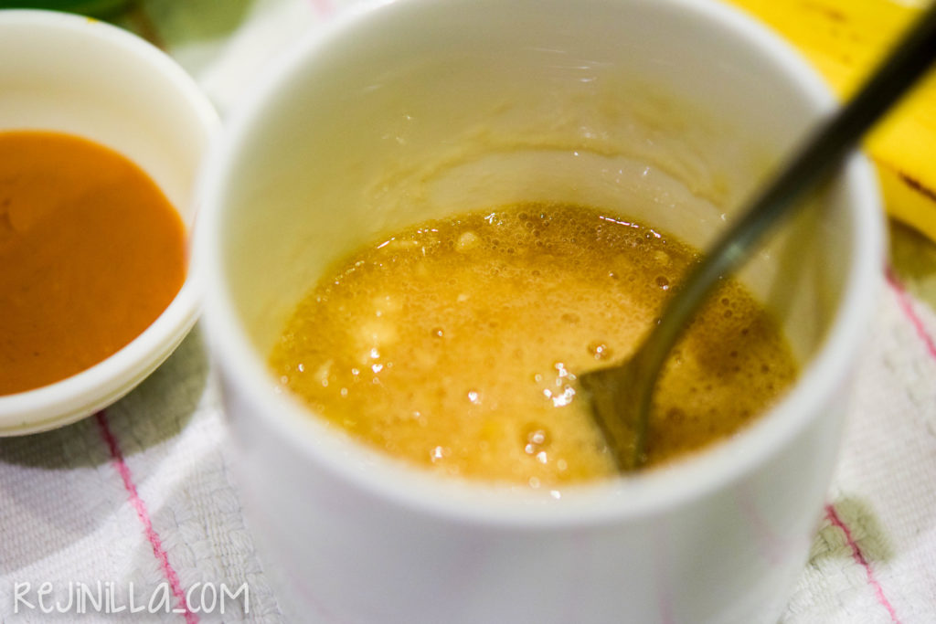 Pon el plátano en la taza y con un tenedor aplasta, agrega la clara de huevo y revuelve para batir, agrega la vainilla y batae bien. Después agrega la crema de cacahuate (si puedes, usa una natural y sin azúcar). Integra bien.