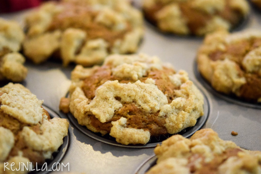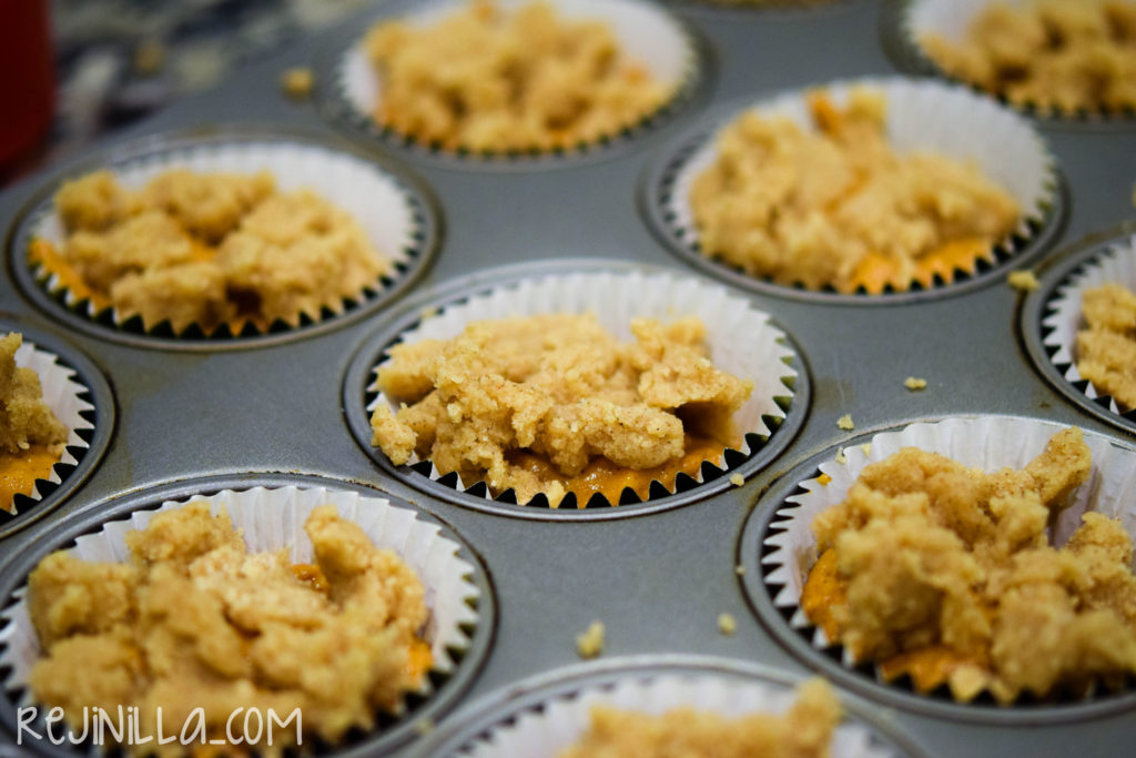 Encima, espolvorea un poco de la mezcla de galleta en pedacitos sobre cada muffin, aplastando ligeramente para que los pedazos se “peguen” a la base de muffin.
