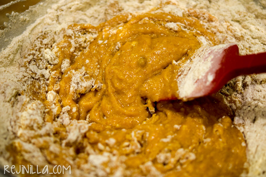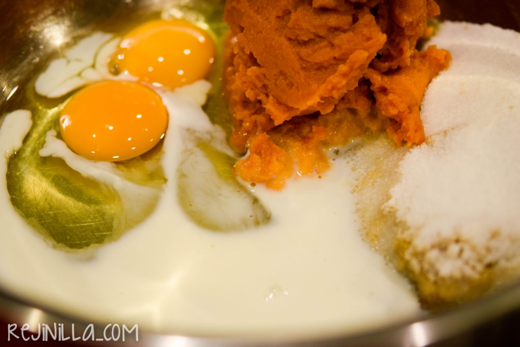 Y en un bowl grande mezcla la calabaza, huevo, azúcar y leche.