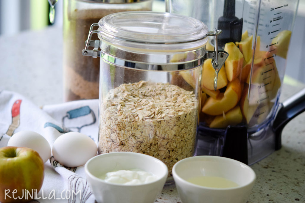 Empieza poniendo la manzana en la licuadora, en pedazos. Ahi mismo, pon el azúcar, yogurt y avena. Muele hasta que quede un puré grumoso. Agrega el huevo y vuelve a moler unos segundos, al último agrega el aceite y continúa moliedo unos segundos más para que quede una masa más homogénea.