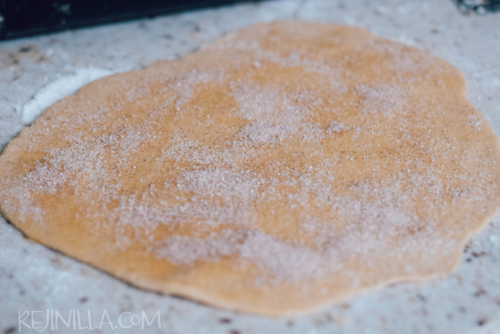 Usando un poco de harina, extiende la masa lo más delgado posible. Barniza de mantequilla (usa una brocha de silicón o la parte de atrás una cuchara o espátula). Espolvorea con la mezcla de azúcar y canela. Voltea la masa y repite.